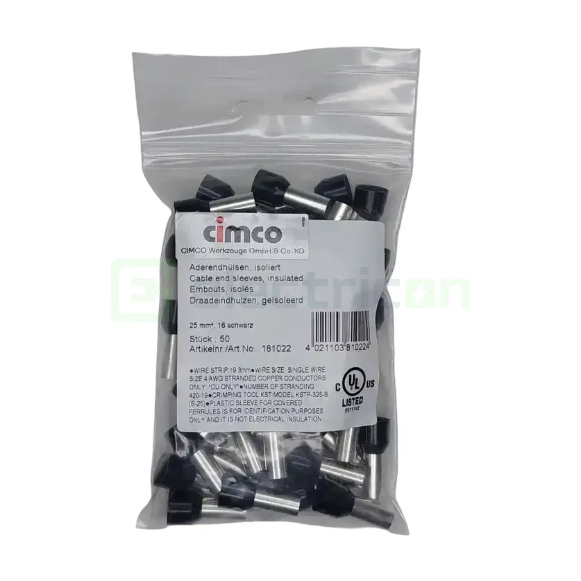 Ferulă izolată conformă cu norma DIN 46228, parte 4, seria de culori 1. Destinată utilizării cu conductori din cupru fine-stranded, fereula previne deteriorarea și îmbinarea necorespunzătoare. Culoare: negru (RAL 9011). Pachet de 50 de bucăți, greutate totală ~0,13 kg.