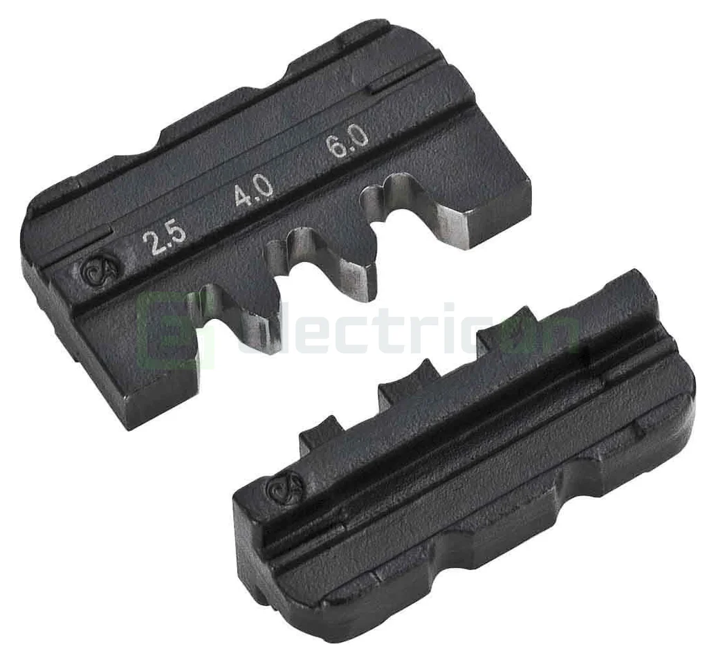 Profil de înlocuire pentru sistemul de clești de crimpare Click'n'Crimp 106005, 106000, destinat conectorilor solari MC4 cu secțiuni de cablu între 2.5 mm² - 6 mm². Profilurile de crimpare Click'n'Crimp pot fi personalizate conform cerințelor utilizatorului: inserții pentru profil de crimpare pentru conectori solari TIP MC 4 de la 2.5 mm² la 6 mm² (C4), 1 pereche.