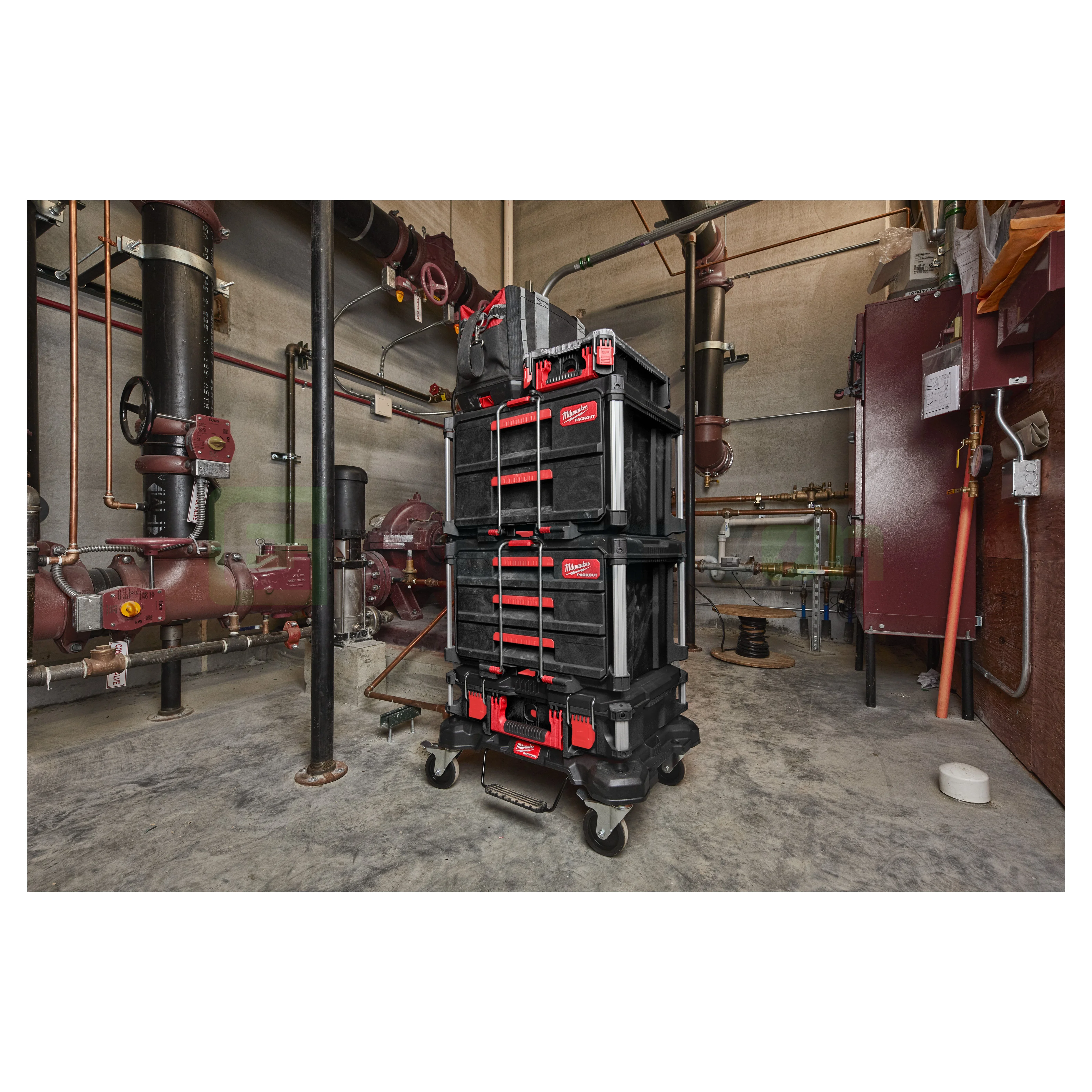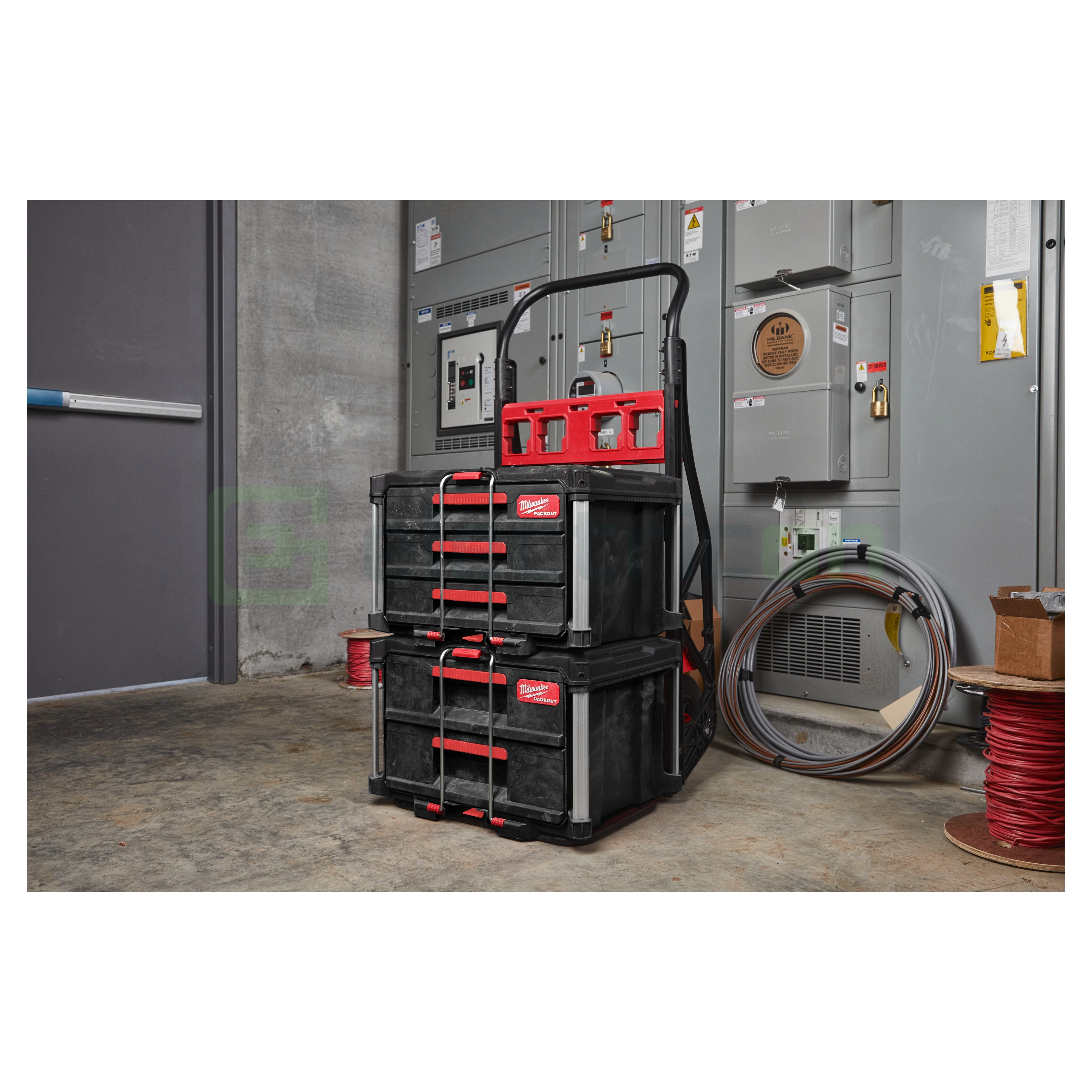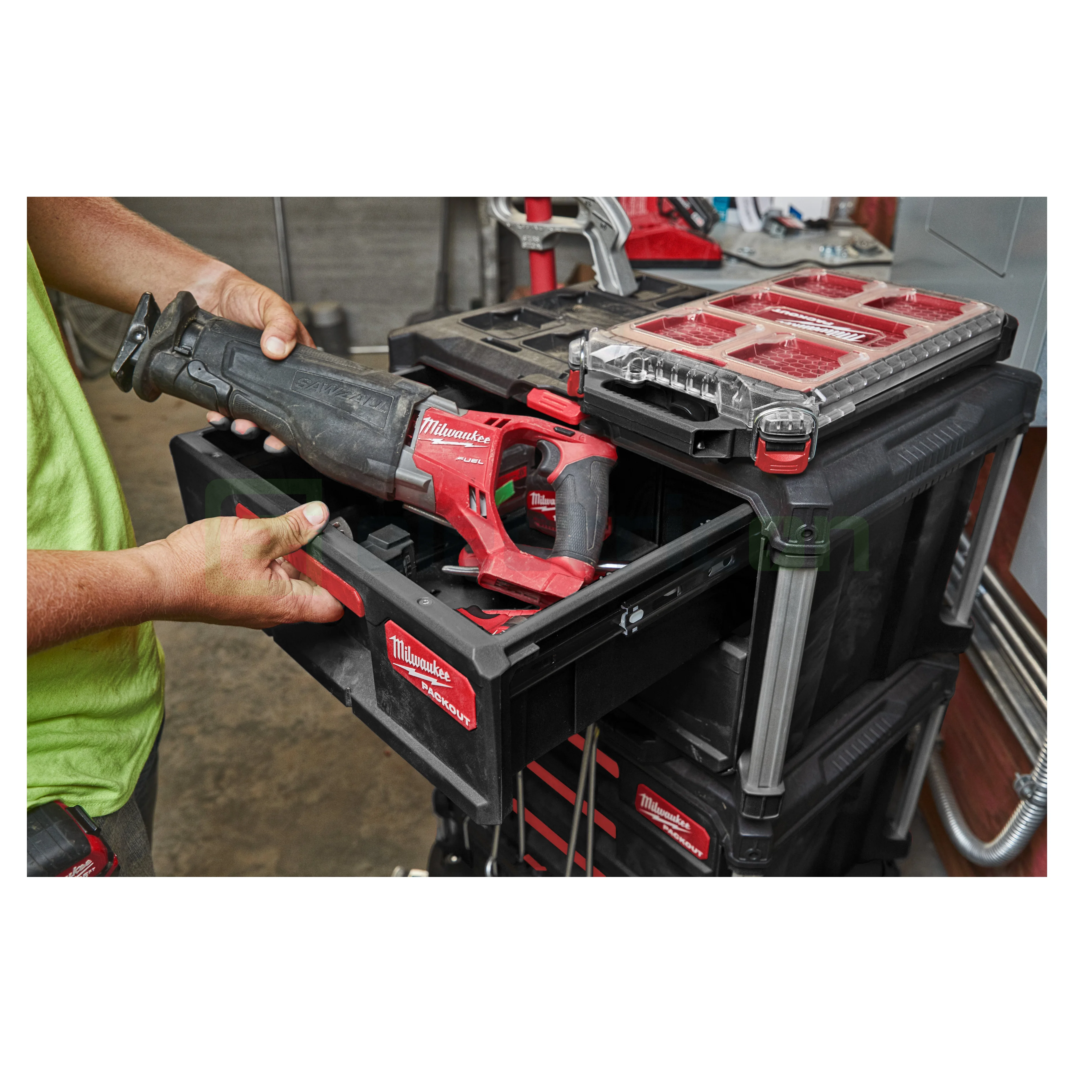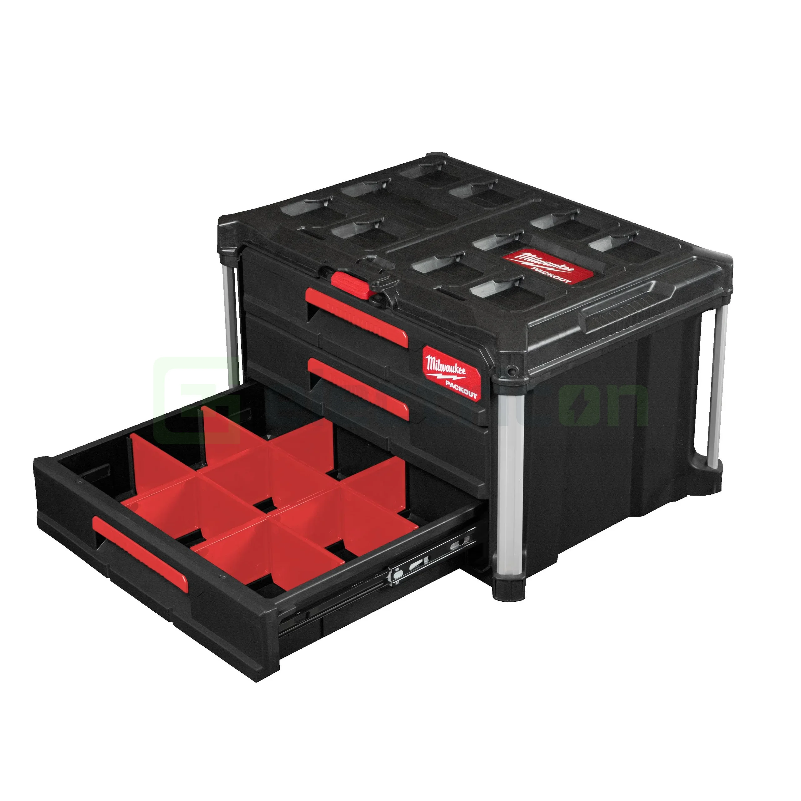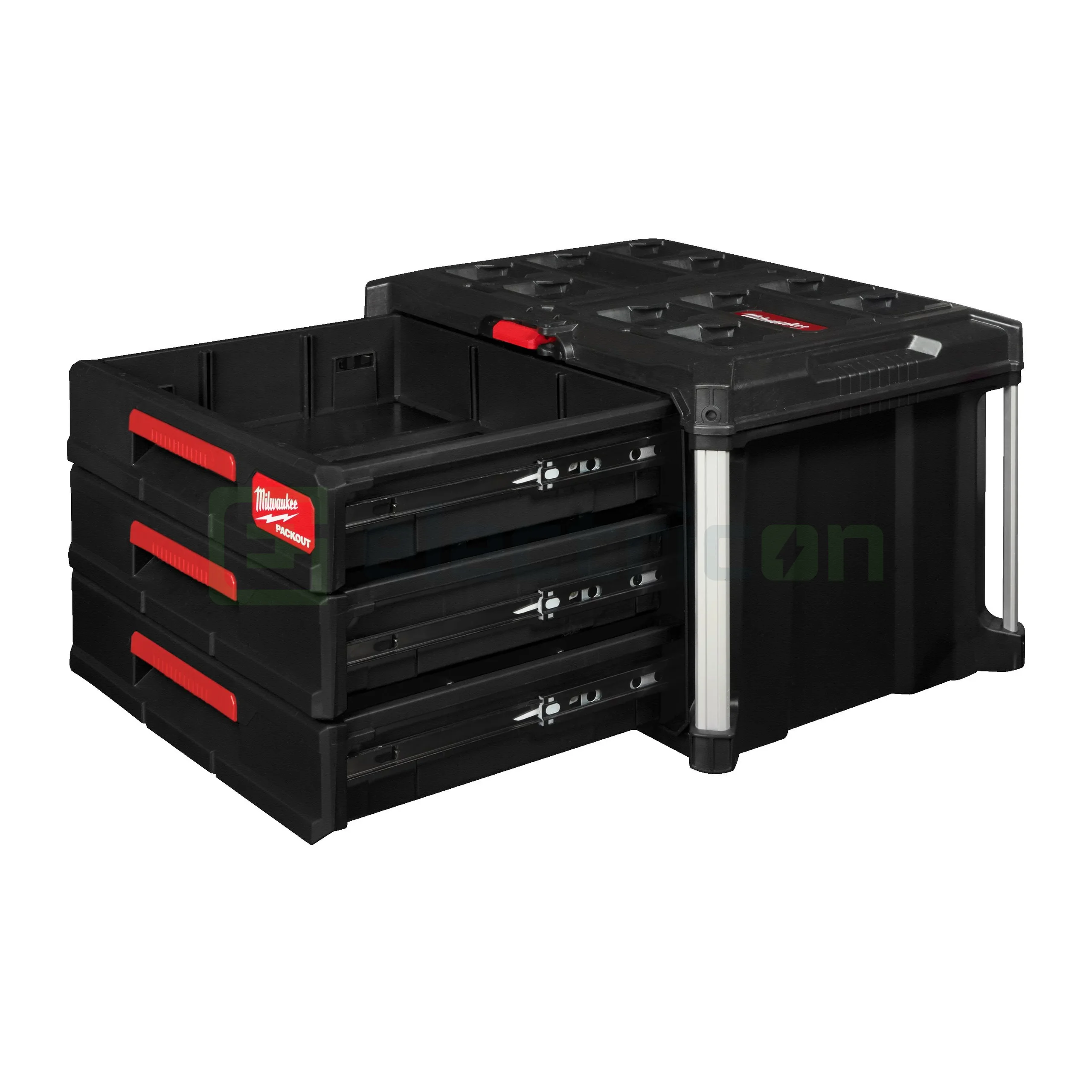 Cutia de scule cu sertare PACKOUT™ permite accesul simplu la scule, chiar dacă acestea se află pe fundul stivei PACKOUT™.