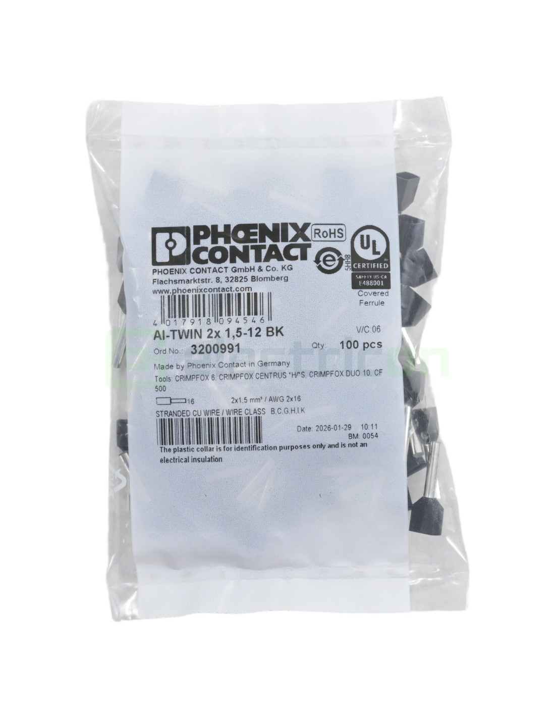 - Tip: AI-TWIN 2X 1,5 -12 BK; Producător: Phoenix Contact; Configurație: ferulă dublă (TWIN) pentru 2 conductori; Secțiune: 2 x 1.5 mm²