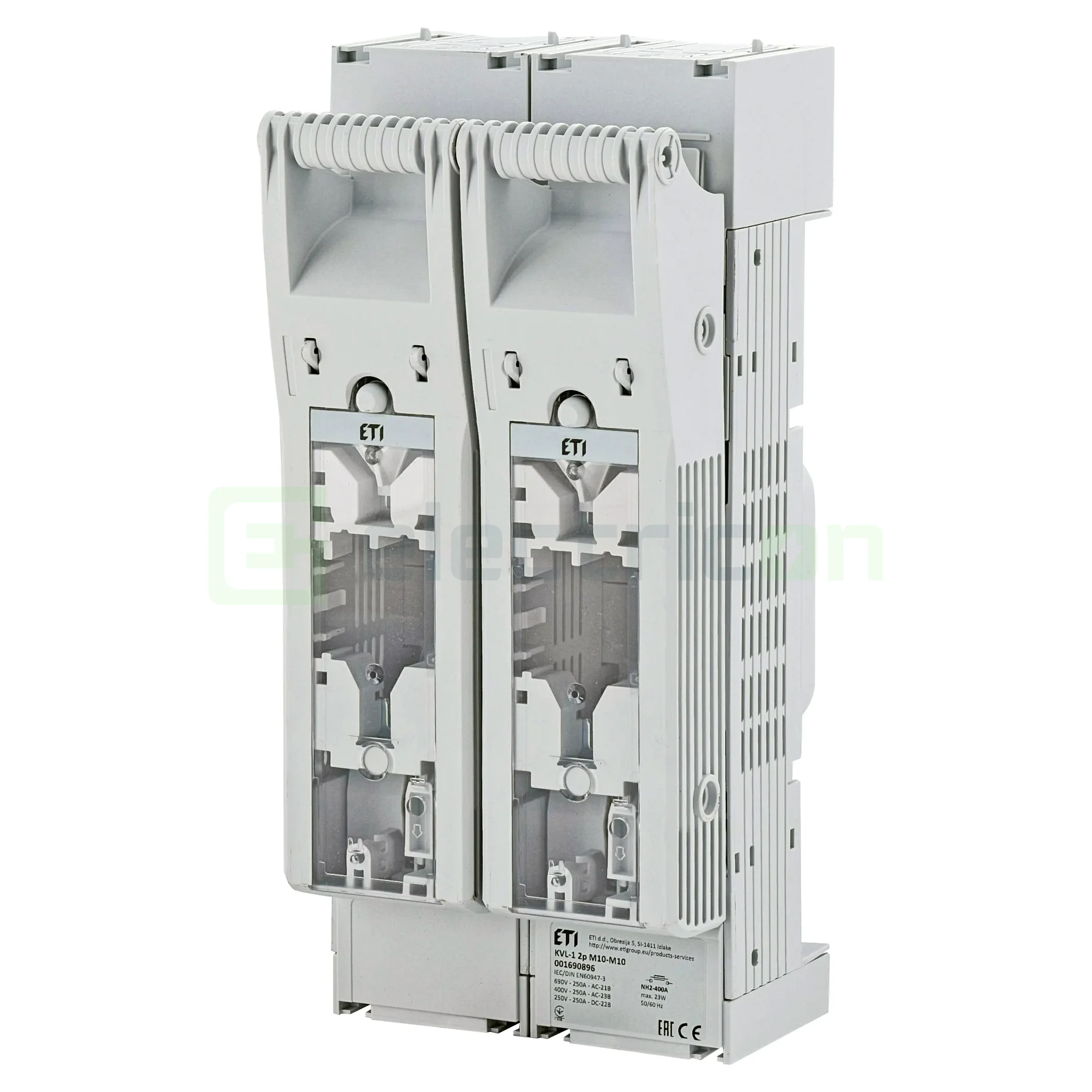 ETI KVL-1 2p M10-M10 (001690896) este un soclu portfuzibil (separator cu siguranțe fuzibile) orizontal pentru siguranțe tip NH1, cu 2 poli, curent nominal 250A, tensiune nominală 690V AC / 440V DC, terminale conexiune principale M10-M10 (tip șurub plat), categorie utilizare AC-23B, DC-22B, cu funcție întrerupător general și separator de siguranță, montaj pe panou sau placă de bază, destinat protecției și separării circuitelor de distribuție în instalații industriale.