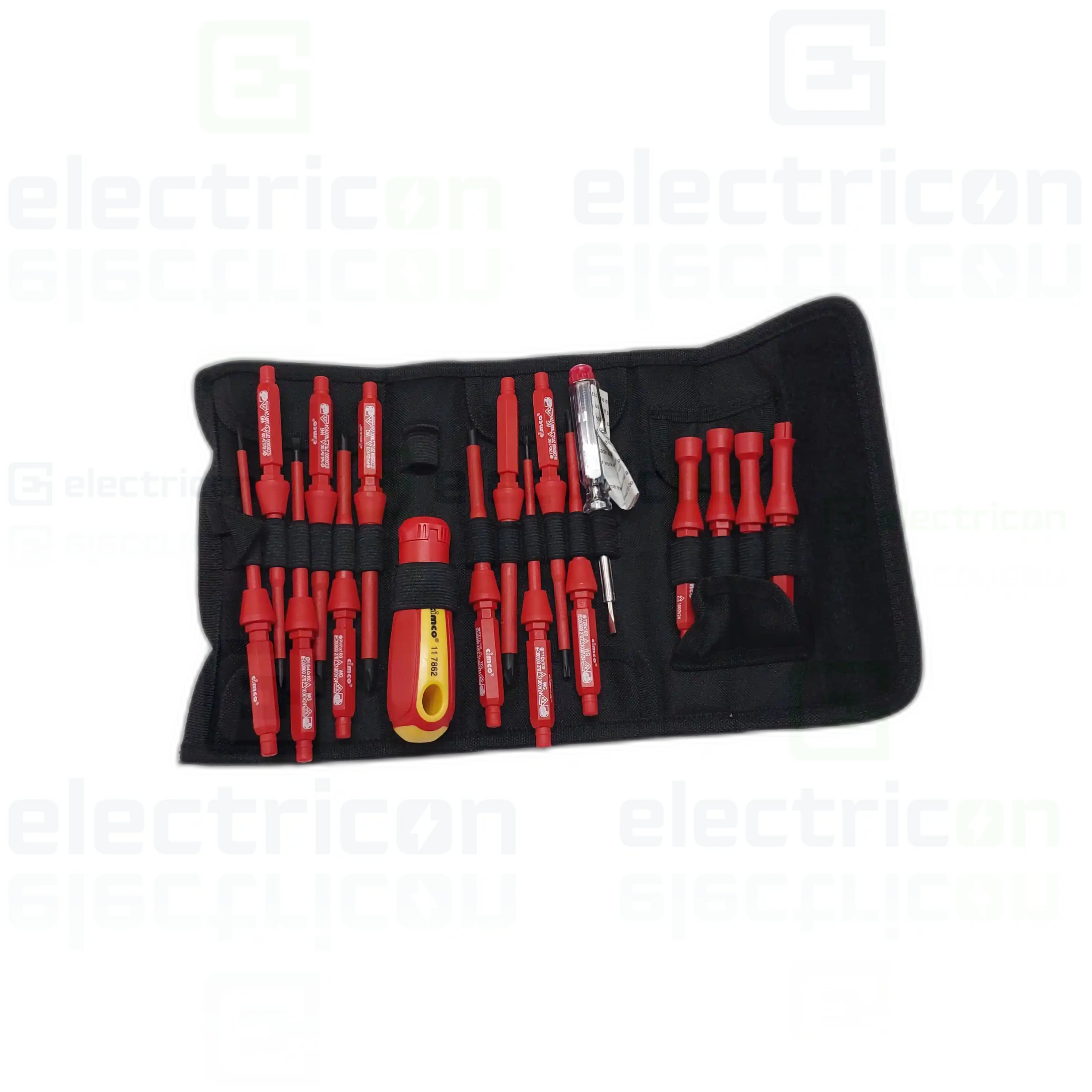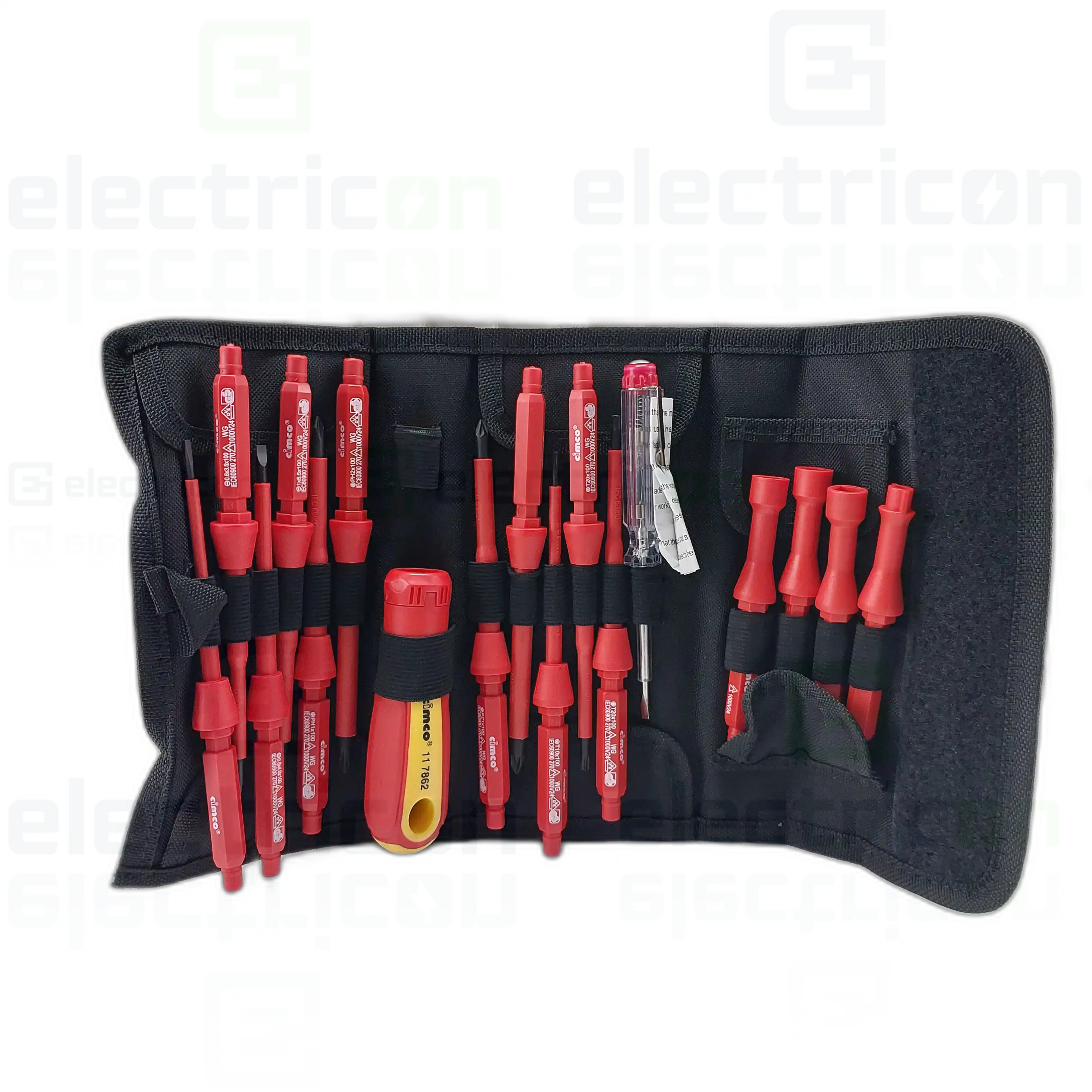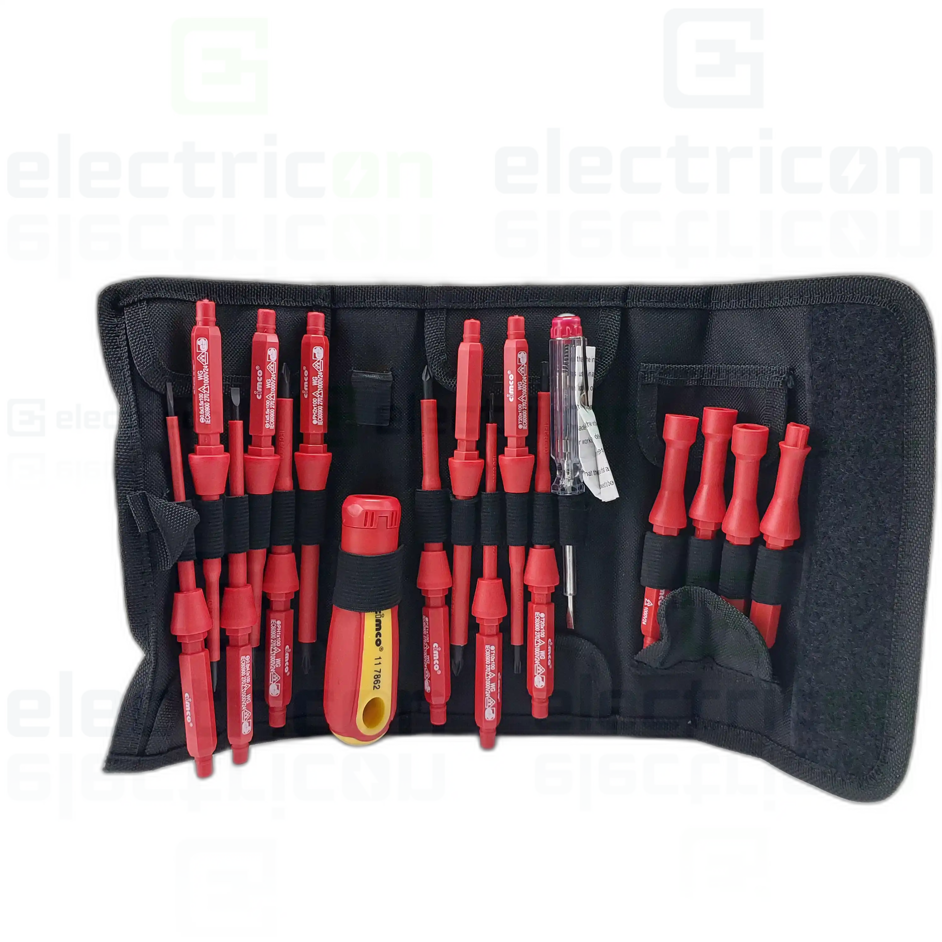 Set de lame interschimbabile pentru șurubelniță VDE, 18 piese, cu mâner de șurubelniță în două componente, prevăzut cu lame complet izolate și vârfuri brunate. Include capac rotativ pentru lucrări de electronică, tester de fază 110-250 V și husă practică din nylon cu agățătoare și curea pentru centură. Șurubelnița și lamele sunt izolate conform IEC 60900 până la 1.000 V AC și sunt testate GS.