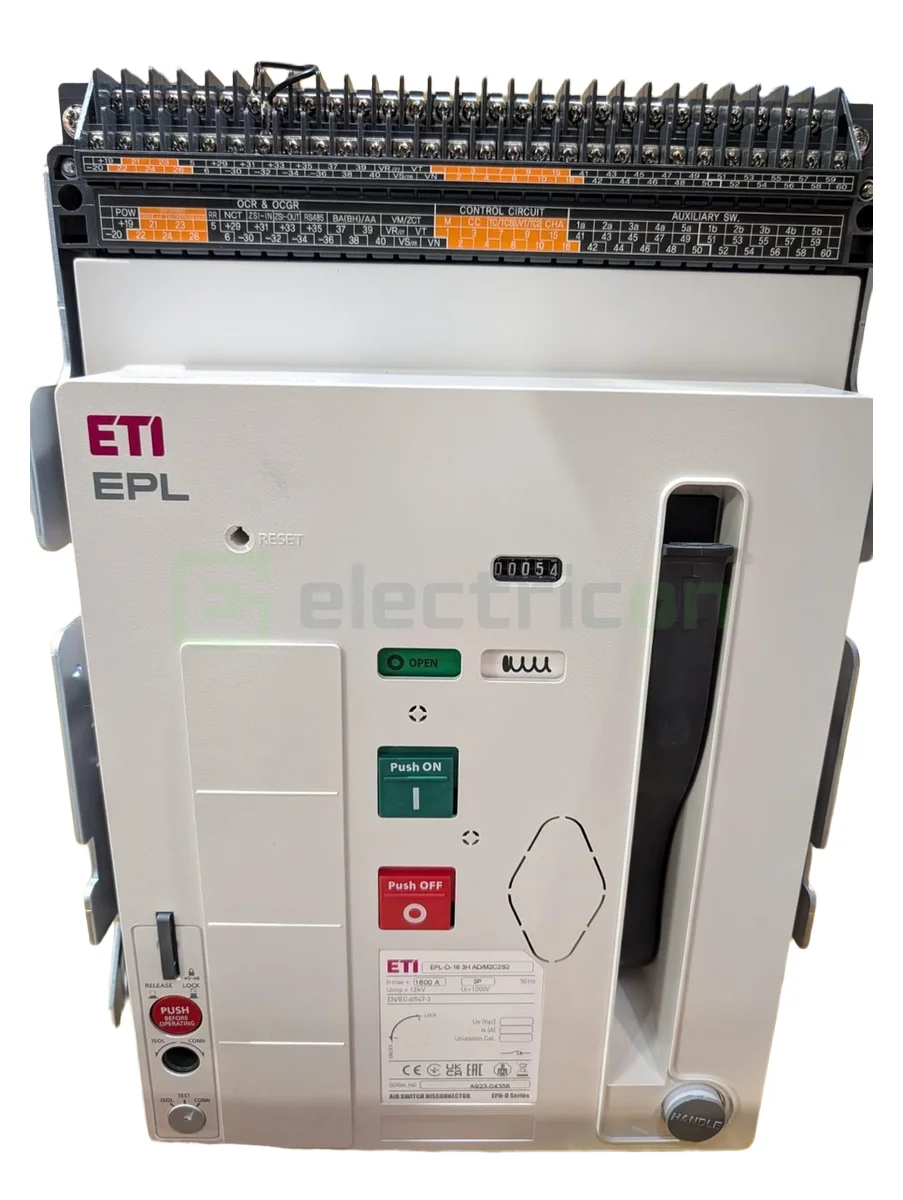 Separator profesional ETI 1600A curent nominal. 3P trifazat AC-22. 690V tensiune nominală industrial. EPL-D-16 capacitate extremă. Contacte argint durabile. Indicator poziție 0/1. Interblocare opțional. Temperatura -25...+55°C. Inox/standard/zinc finisaj ACM2/C2/S2. EN 60947-3 conform. CE certificare. ETI quality 2 ani garanție.