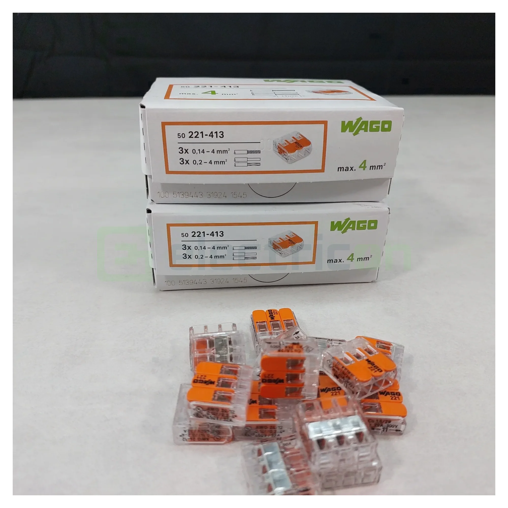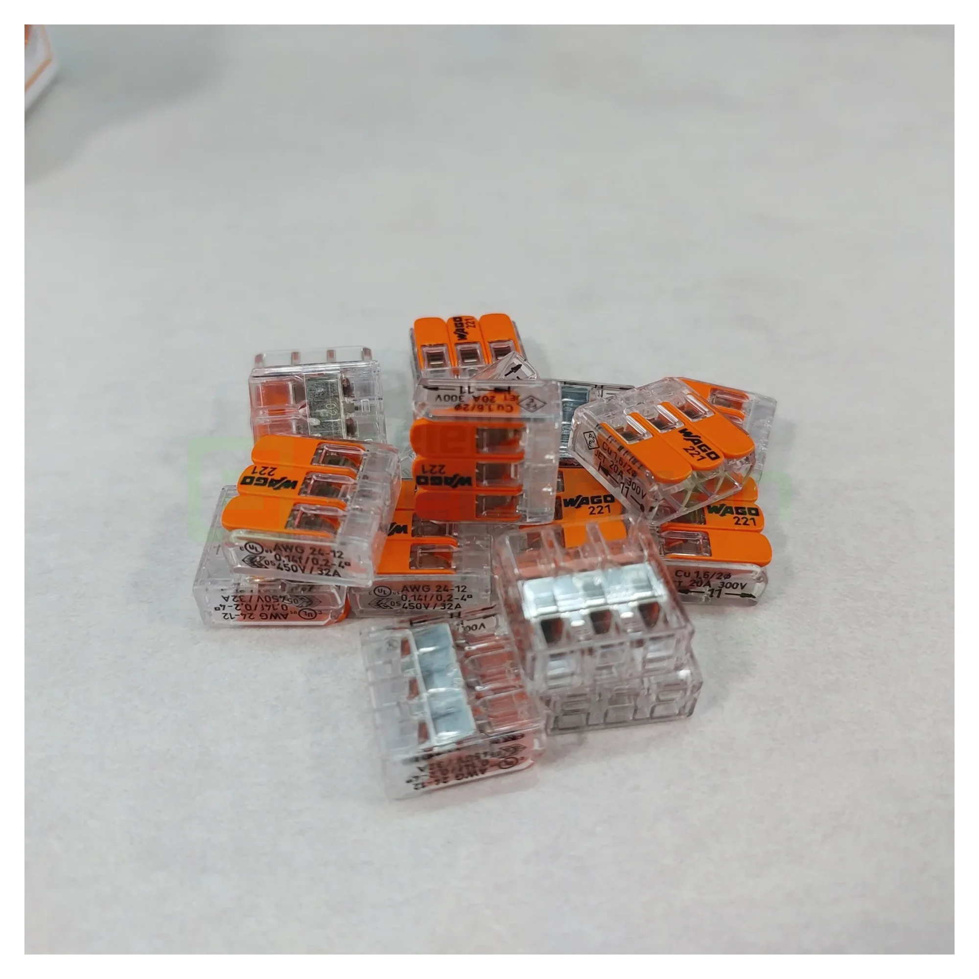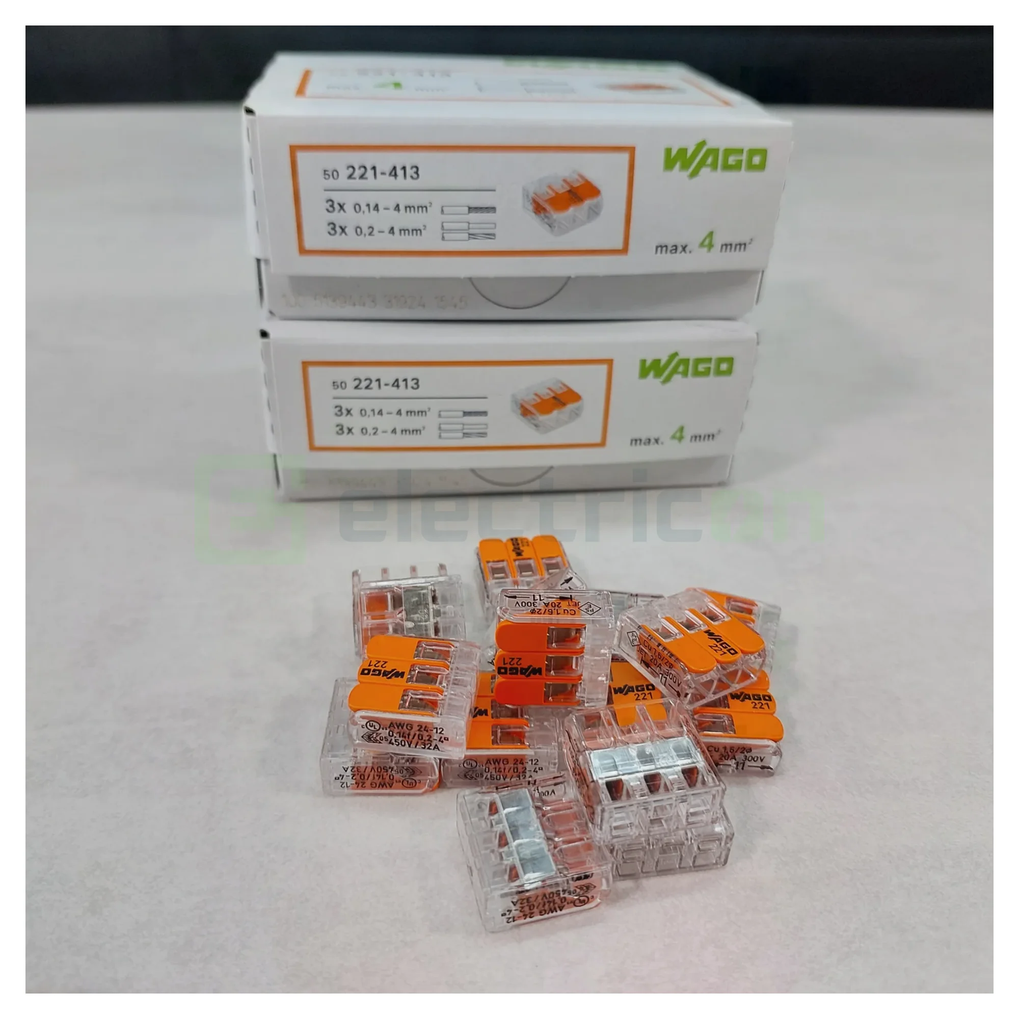 300 x Clemă legătură doză pentru cablu lițat, 3 conductori 0.2 - 4mm², Wago, 221-413